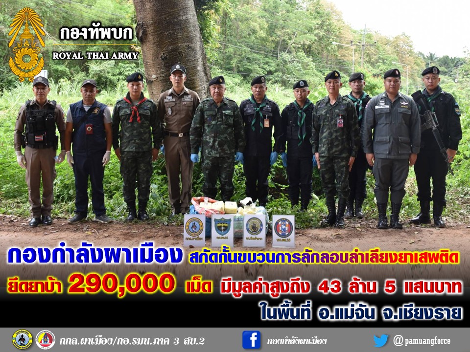 (มีคลิป) กองกำลังผาเมือง สกัดกันขบวนการลักลอบลำเลียงยาเสพติด ยึดยาบ้า 290,000 เม็ด มีมูลค่าสูงถึง 43 ล้าน 5 แสนบาท ในพื้นที่ อ.แม่จัน จ.เชียงราย
