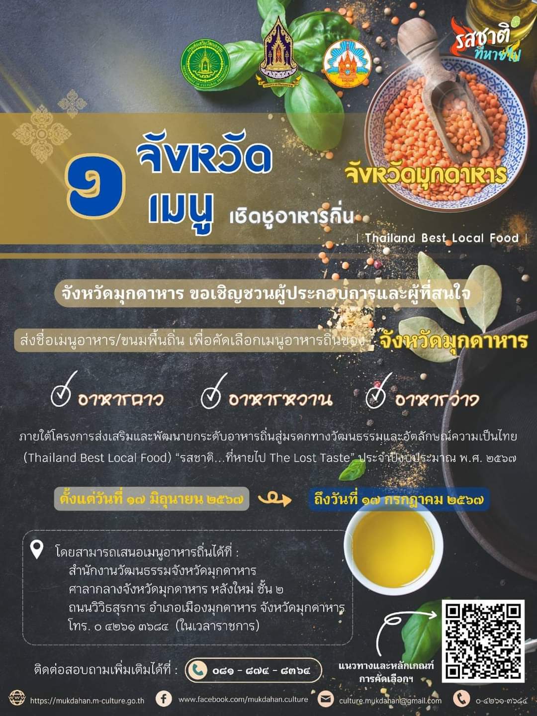 มุกดาหาร ขอเชิญชวนผู้ประกอบการและผู้สนใจ ส่งชื่อเมนูอาหาร/ขนมพื้นถิ่น เพื่อคัดเลือกเมนูอาหารถิ่นของจังหวัดมุกดาหาร ภายใต้โครงการส่งเสริมและพัฒนายกระดับอาหารถิ่นสู่มรดกทางวัฒนธรรมและอัตลักษณ์ความเป็นไทย (Thailand Best Local Food) ประจำปี พ.ศ. 2567