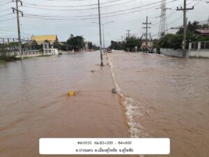 – ทล.101 คลองโพธิ์ – ท่าช้าง ช่วง กม.ที่ 82+200 – 84+600 อ.เมืองสุโขทัย ระดับน้ำสูง 45 ซม. เจ้าหน้าที่คอยอำนวยความสะดวกด้านความปลอดภัย