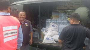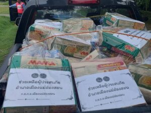 นายชาติชาย น้อยสกุล เจ้าของสะพานบุญครูหนึ่ง เปิดเผยว่า สิ่งของบรรเทาทุกข์ที่ถูกส่งไปโดยเฮลิคอปเตอร์ ประกอบด้วย ถุงยังชีพ ของอำเภอเมืองแม่ฮ่องสอน จำนวน 60 ชุด และยารักษาโรค 1 ลัง ส่วนของสะพานบุญครูหนึ่ง เป็นน้ำดื่ม 100 โหล เพื่อช่วยบรรเทาทุกข์ให้แก่ราษฎรผู้ประสบภัยและติดอยู่ในหมู่บ้านซึ่งไม่สามารถเดินทางออกมาได้เนื่องจากถนนถูกตัดขาด